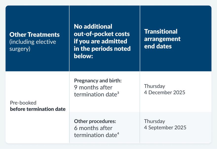 During the transitional period, the hospital and the health funds have agreed that the terms of the contract will continue to apply to certain patients and for a certain duration (these are sometimes referred to as transitional arrangements). The table below outlines the circumstance and the duration in which the transitional period will apply to AHSA health fund members.